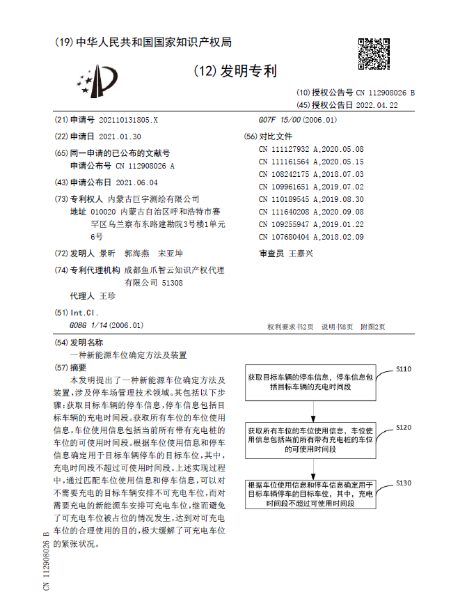 2023年9月,集佳律所接受客戶委托代理發明專利無效宣告請求,涉案專利名為“一種新能源車位確定方法及裝置”的發明專利ZL202110131805.X,該專利共有7項權利要求,包括3項獨立權利要求,申請日為2021年1月30日,并于2022年4月22日獲得授權。涉案專利所保護的技術方案涉及新能源車輛停車信息與充電場站及充電車位匹配的方法及裝置。