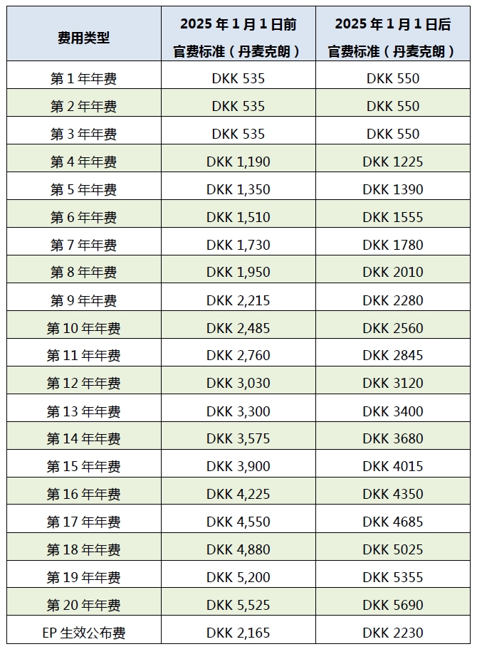 2025年1月7日,丹麥專利商標(biāo)局在其官網(wǎng)上公布,對(duì)包括已生效的歐洲專利在內(nèi)的專利公布和續(xù)展費(fèi)用進(jìn)行價(jià)格調(diào)整,費(fèi)用上漲了約3.0%。此次調(diào)整自2025年1月1日起生效。