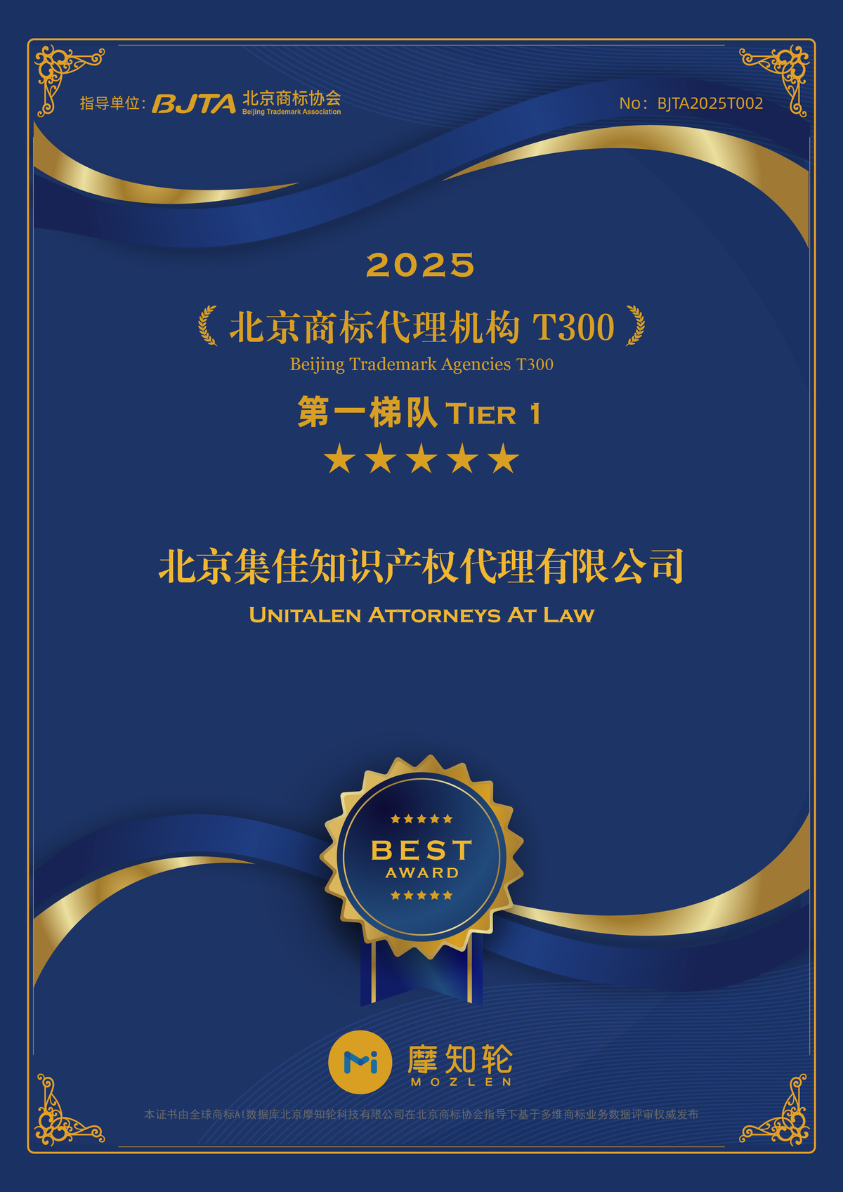 近日,北京商標協會成立30周年慶典暨商標發展大會在京隆重舉行,會上正式發布“北京商標代理機構T300”榜單。北京集佳知識產權代理有限公司憑借在商標領域過硬的專業實力和卓越的專業服務,榮譽入選2025年度北京商標代理機構T300——第一梯隊TIER 1。