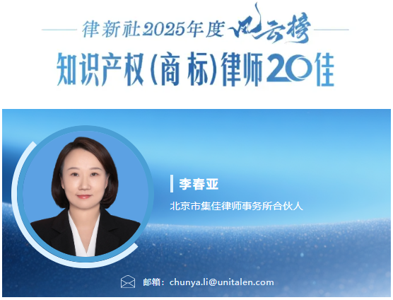 2025年10月22日,律新社重磅發(fā)布“律新社2025年度風(fēng)云榜:知識(shí)產(chǎn)權(quán)(商標(biāo))律師20佳”榜單,集佳合伙人李春亞律師憑借在知識(shí)產(chǎn)權(quán)領(lǐng)域精湛的專(zhuān)業(yè)實(shí)力、杰出的業(yè)績(jī)表現(xiàn)及良好的客戶(hù)口碑,榮登20佳榜單!