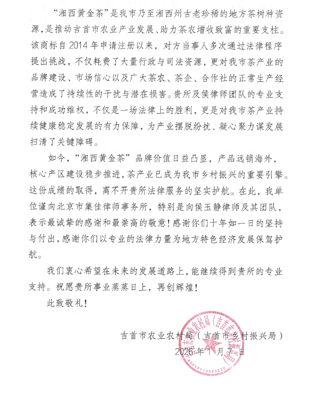 近日,集佳收到來自湖南省吉首市農業農村局的感謝信,“湘西黃金茶”地理標志證明商標行政訴訟系列案件歷時近十年,終于在吉首市農業農村局與集佳律師團隊的共同努力下畫上了圓滿的句號。信中,吉首市農業農村局對集佳律所及侯玉靜、田達良律師們的專業水準和精致服務給予高度評價!