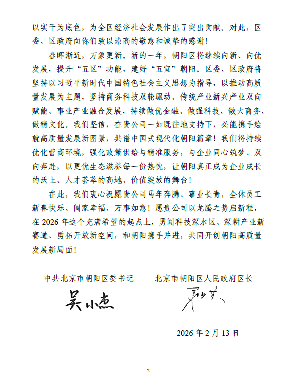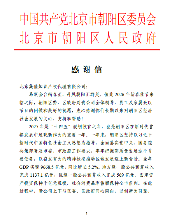 2026年2月13日,新春佳節來臨之際,集佳收到北京市朝陽區委、區政府發來的感謝信。信中,區委、區政府肯定和感謝了集佳長期以來為朝陽區經濟社會發展作出的貢獻,并對集佳全體領導、員工及家屬致以節日的問候和美好的祝愿!
